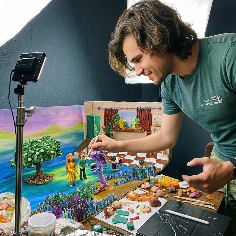 Commercial-ready visuals: craft stop-motion, 2D, and AI-hybrid — from concept to final cut.